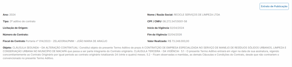 O segundo, assinado em abril de 2022 com a empresa Recicle Serviços de Limpeza LTDA, totaliza R$ 73.248.000.000,00, também para serviços similares nos distritos da cidade.