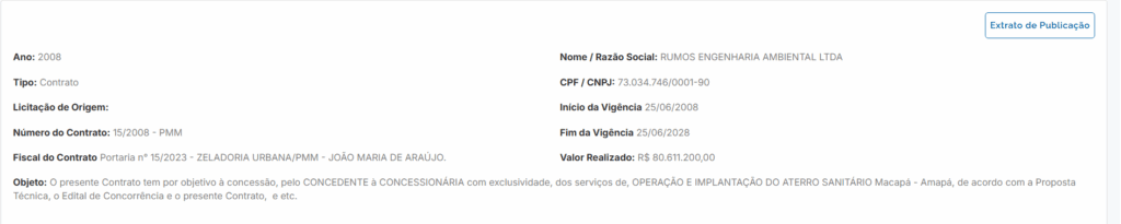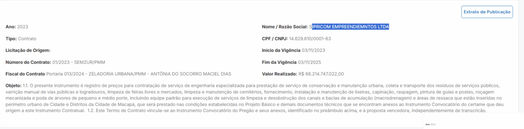 O primeiro contrato, firmado em novembro de 2023 com a empresa Spiricom Empreendimentos LTDA, tem como objeto a prestação de serviços de zeladoria urbana — varrição, coleta, roçagem, limpeza de canais e pintura de guias — e apresenta um valor realizado de R$ 66.214.747.022,00.