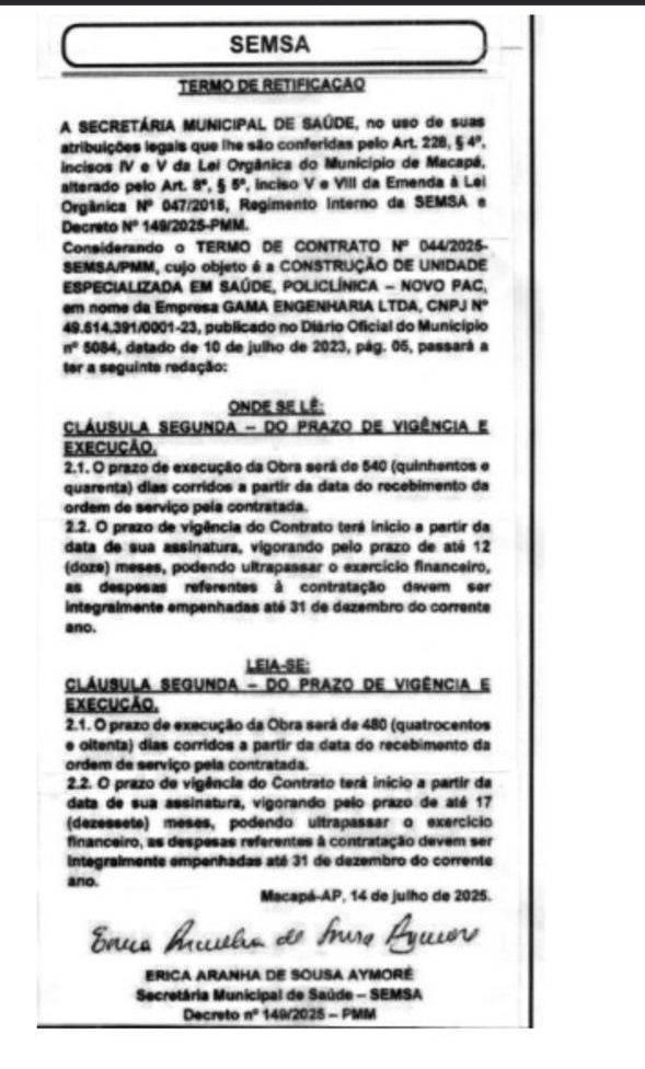 A empresa Gama Engenharia LTDA, aberta em 15 de fevereiro de 2023, aparece como contratada pela Prefeitura de Macapá, por meio da Secretaria Municipal de Saúde (SEMSA), para a execução da obra de construção da Unidade Especializada em Saúde – Policlínica (Novo PAC).